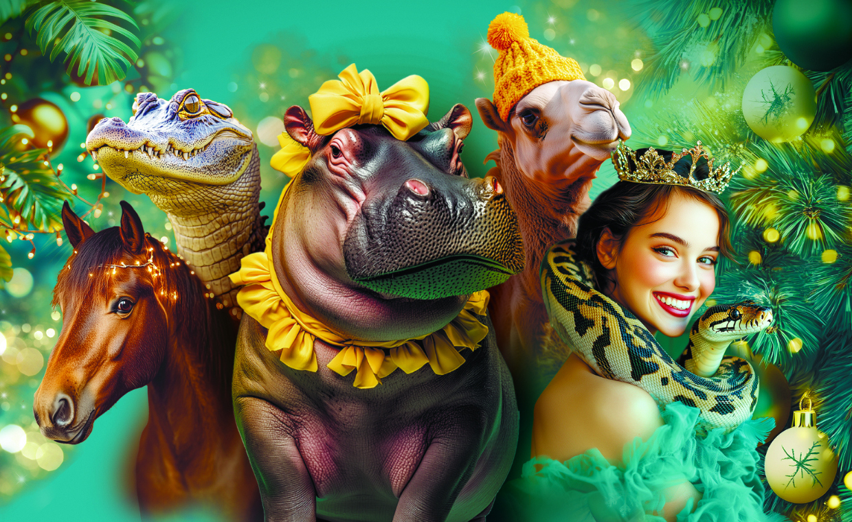 «Новогоднее тропик шоу» – это не только традиционные атрибуты главного зимнего праздника, но и необычные сюрпризы и экзотические животные. В программе зрителей ждут необычные приключения Деда Мороза, который отправится в путешествие по разным странам. Его спутниками по новогодней сказке станут талантливые и бесстрашные акробаты и воздушные гимнасты, ловкие жонглеры, юмористы-клоуны, а также четвероногие артисты – от обаятельных собачек до……огромного бегемота!