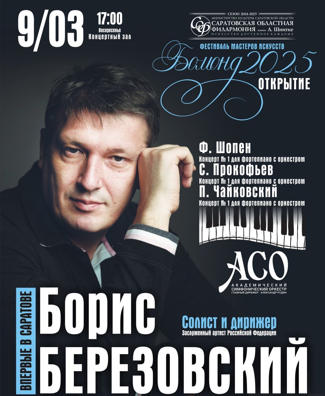 Саратовская областная филармония имени А. Шнитке приглашает на Открытие фестиваля мастеров искусств «Бомонд — 2025». Элита мирового исполнительского искусства на Саратовской сцене. Впервые в Саратове выступит Борис Березовский.