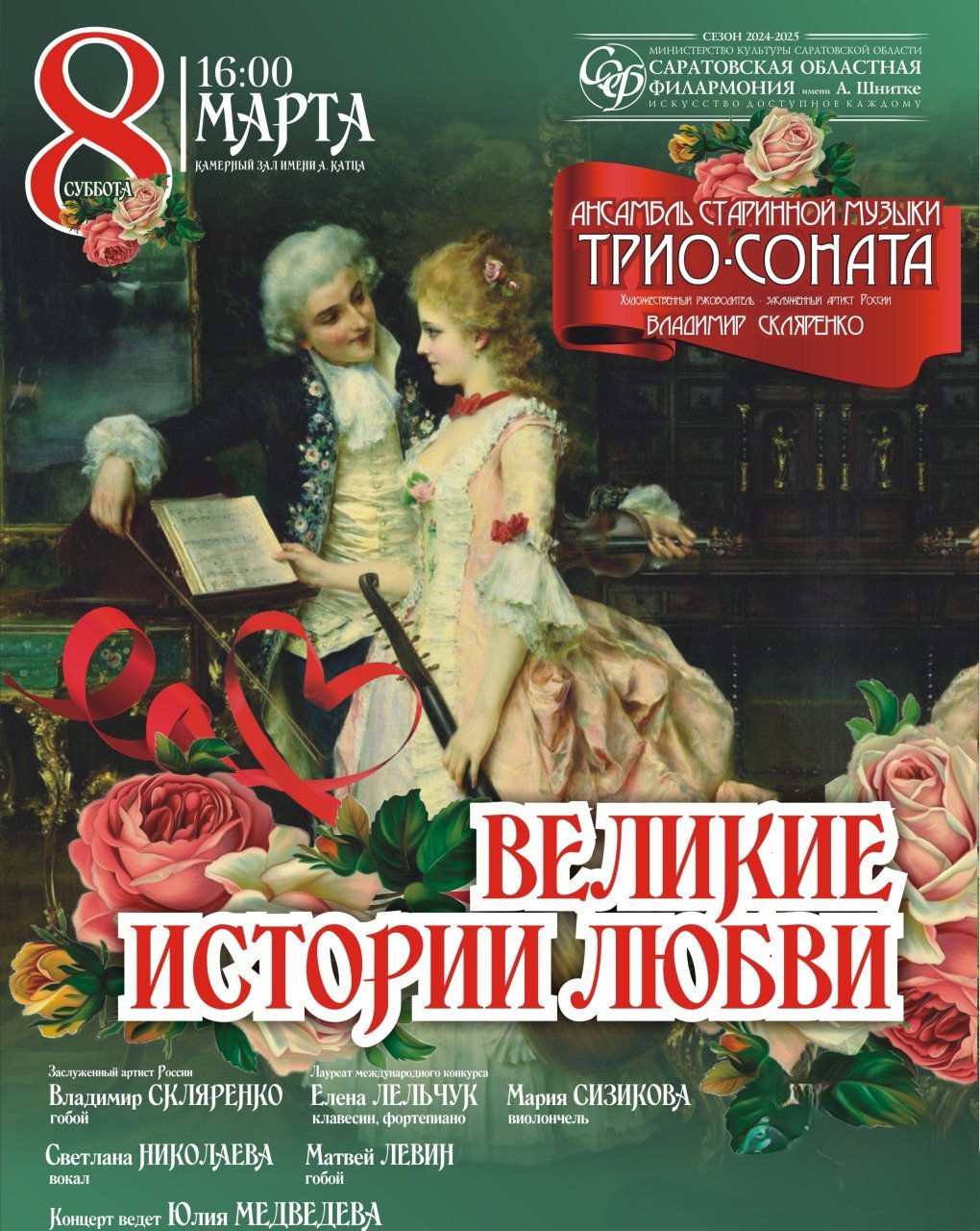 Саратовская областная филармония имени А. Шнитке приглашает на концертную программу ансамбля старинной музыки «Трио-соната» «Великие истории любви», посвященную Международному женскому дню 8 марта.