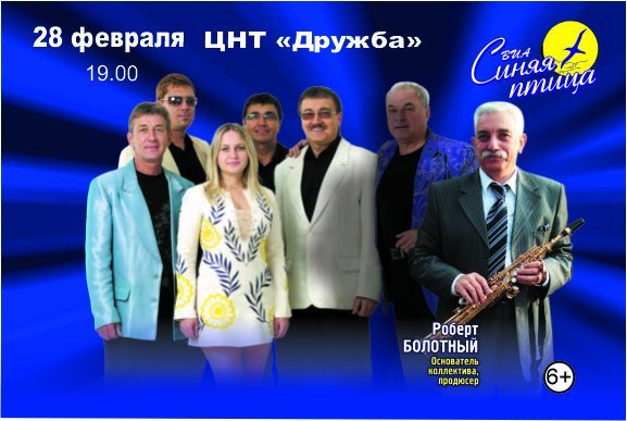 Уйти с головой в атмосферу золотых 70х-80х, услышать новые песни, насладиться любимыми хитами ансамбля и вернуться назад полными свежих сил и энергии Вас приглашает легендарный ВИА «Синяя птица».